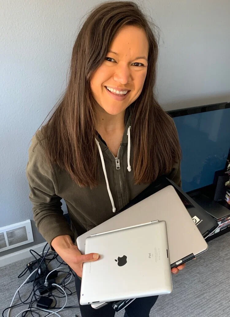 Jessica Lane of SoMa Equity Partners donating used laptops and tablets to Hamilton Families.
